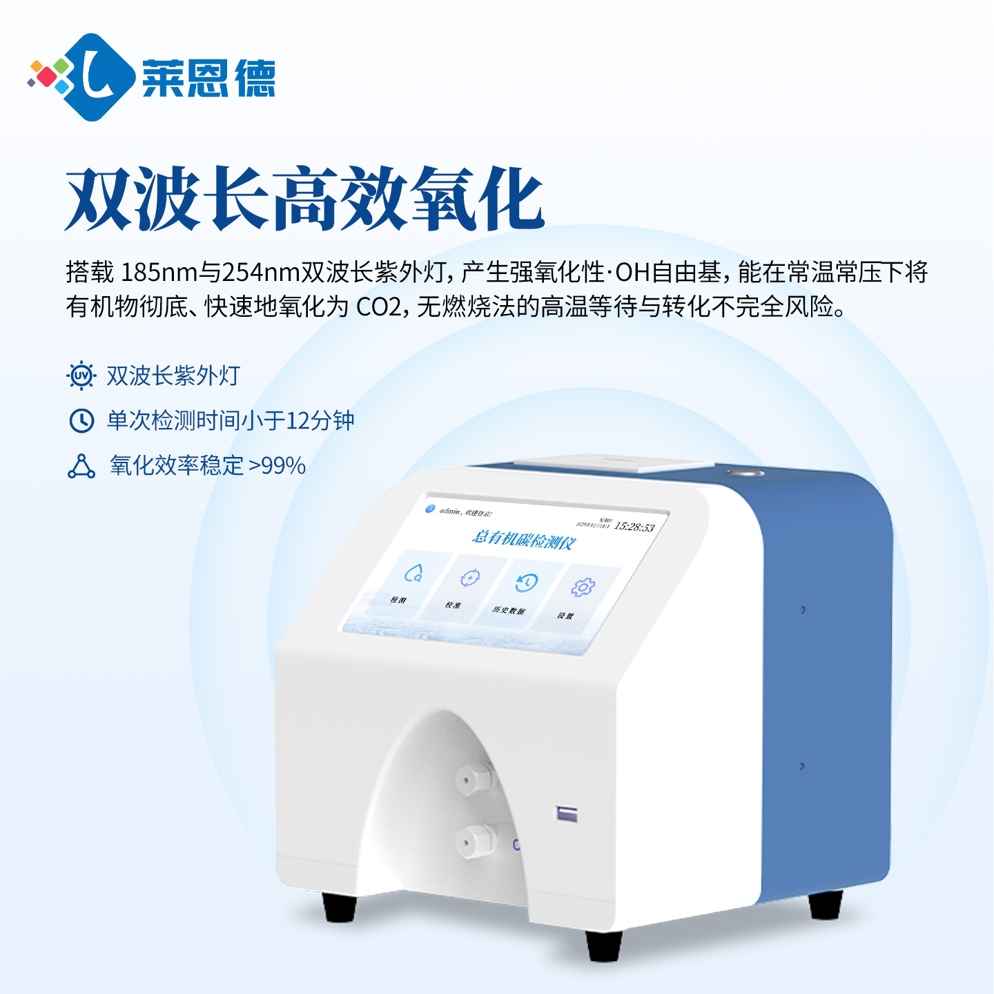 (2)快速的氧化能力:搭載 185 nm 與 254 nm 雙波長紫外燈,產(chǎn)生強(qiáng)氧化性·OH自由基,能在常溫常壓下將有機(jī)物徹底、快速地氧化為 CO?,單次檢測時(shí)間小于 12 分鐘,氧化效率穩(wěn)定 >99%,無燃燒法的高溫等待與轉(zhuǎn)化不完全風(fēng)險(xiǎn)。