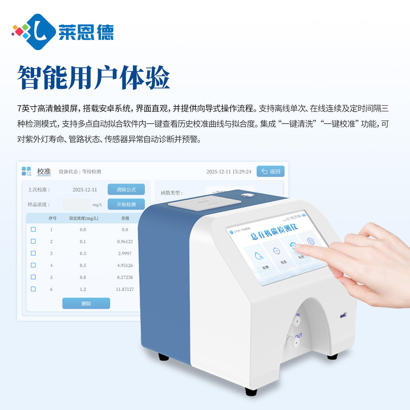 (1)全觸控智能操作系統(tǒng):配備7英寸高清電容觸摸屏,運(yùn)行深度定制的Android系統(tǒng)。UI界面直觀友好,提供向?qū)讲僮髁鞒?,從開機(jī)、清洗、校準(zhǔn)到檢測,步步引導(dǎo),大大降低操作人員培訓(xùn)門檻。